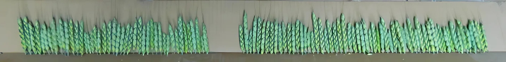 As soon as the wheat started to green up, the differences started to show (see pictures above). A measured topping of the seed heads (see pictures below) showed the influence of the GMS application visually. A set row length harvested in several locations in both trial areas showed a 40 percent increase (in weight) by the 11½ gallons of row applied GMS eight months earlier!