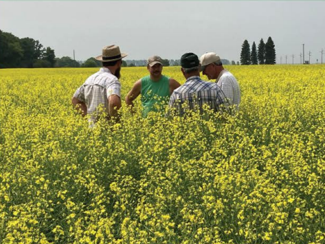 Peaceful farmers in a double crop field with cannoli and soybeans (North Dakota).