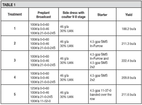 Several years ago, some long time GMS users experimented with placing GMS at different positions when planting corn. Placing GMS at different positions when planting corn has become much easier in recent years as the agricultural equipment companies have created various ways for application, such as with in-furrow technology and 2x2 application. As interest grew for using GMS at various positions during planting time, several articles in The Growers Solution discussed the reasoning for these various approaches. The Growers Solution, Spring 2019, Volume 32 Issue 2, and Spring 2022, Volume 35 Issue 2, discussed in full detail the various positions that GMS could be placed at and what the success of each placement could achieve. These discussions concluded that yield data would be helpful to farmers thinking about various placement positions. A summary of test plots is presented in Table1 and Table 2.