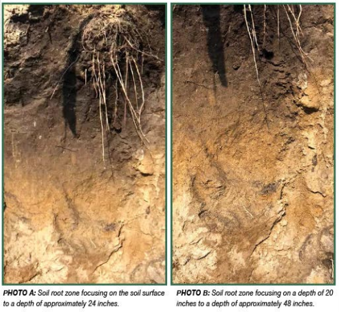 Photographs A and B are two photographs of the same plant root taken at different depths. The large root mass in photograph A is at the soil surface and very impressive for a depth of 14 to 16 inches; however, the large feeding root at the bottom of Photograph B was measured close to 48 to 50 inches in depth.