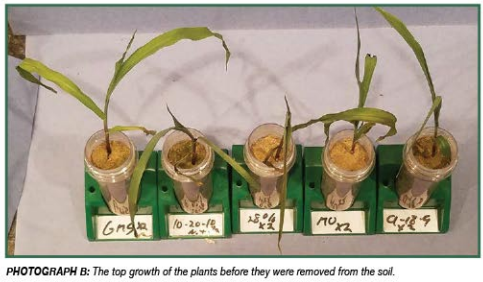 Take a look at Photograph A before reading this section. The plants in the photograph were sprayed twice, four days apart, with a solution of GMS and water equivalent to 2 gallons per acre (per spray), the same solution but with a sample of GMS with no trace elements added to it, 28% nitrogen, molasses, and a 9-18-9 liquid fertilizer. They were also watered only once with pure water, then left to wilt, after which they were plucked, dried, weighed, and the soil tested with the MicroBiometer.